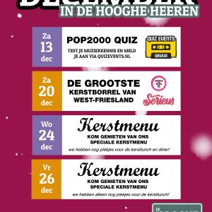 December is aangebroken en wij hebben weer voldoende op de planning staan. Kom lekker pubquizzen, feesten of genieten van een heerlijk kerstdiner! Za 13 dec: