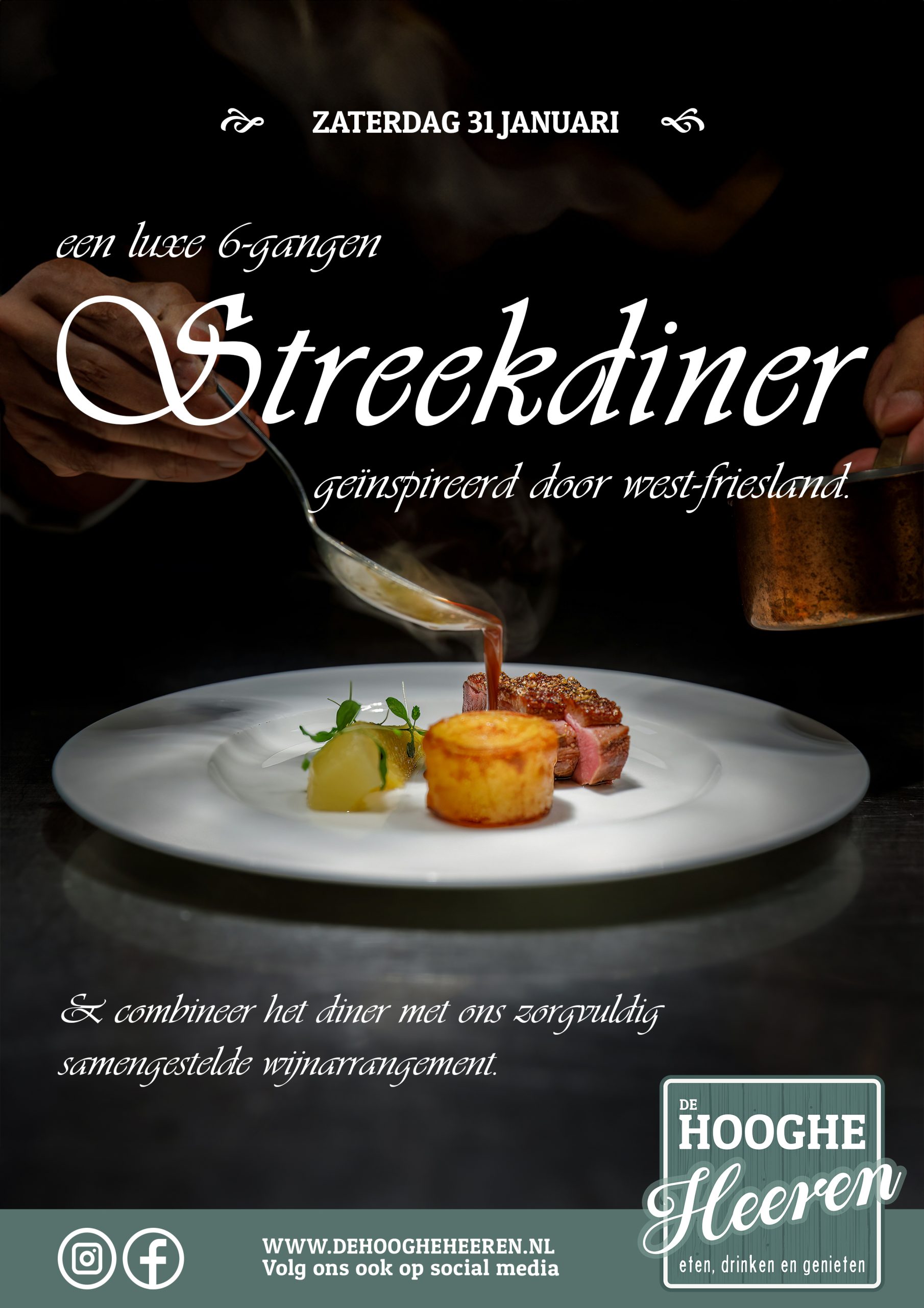 De Hooghe Heeren presenteert: Een luxe 6-gangen diner geïnspireerd door onze roots – West-Friesland. Onder leiding van onze chefs serveren wij u een luxe 6-gangen diner met alles er op en er aan. We beginnen met een heerlijke amuse, gevolgd door 6 gangen die zo veel mogelijk bestaan uit lokale producten. Dan sluiten wij de avond af met een heerlijk kopje koffie of thee onder het genot van verschillende friandises. Een echte fine-dining experience in het mooie hart van Hoogwoud.