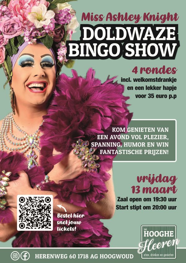 Op vrijdag 13 maart worden we verrast met een avondvullende bingoshow met entertainment van dragqueen Miss Ashley Knight! Verwacht een avond vol muziek, gezelligheid en natuurlijk HELE GROTE PRIJZEN!