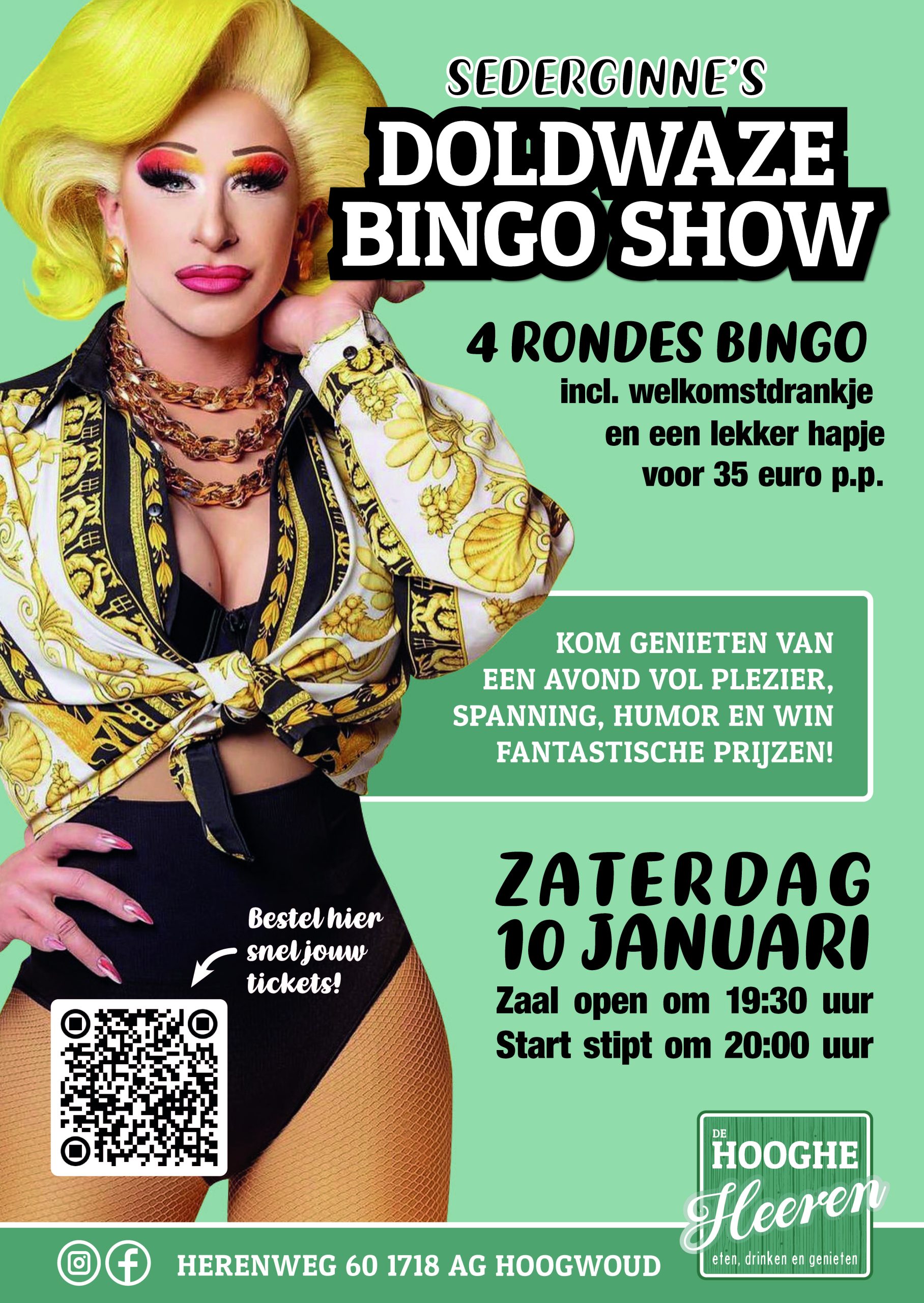Op zaterdag 10 januari presenteren wij een wel hele bijzondere avond… Sederginne’s Doldwaze Bingoshow! – een grote bingo-avond vol muziek, grote prijzen en entertainment van de welbekende Drag Queen Sederginne!